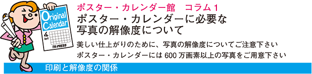 ポスター・カレンダー館では、長年印刷と画像処理に関わってきた技術と経験を生かし、入稿された写真をそのまま印刷にまわすのではなく、入念な画像拡大などの最適化を施しますので、大伸ばしによる鮮鋭度の劣化や画像の荒れを最小限度に抑えた実用充分な美しい仕上がりを得ることが可能です。